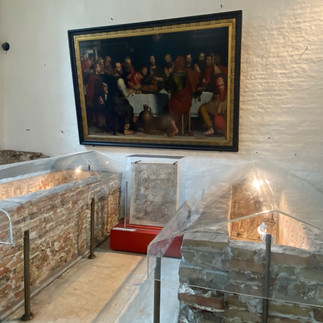 The altarpiece of the large chapel in the southern aisle enshrines the most celebrated art treasure of the church—a white marble sculpture of the Madonna and Child created by Michelangelo around 1504.